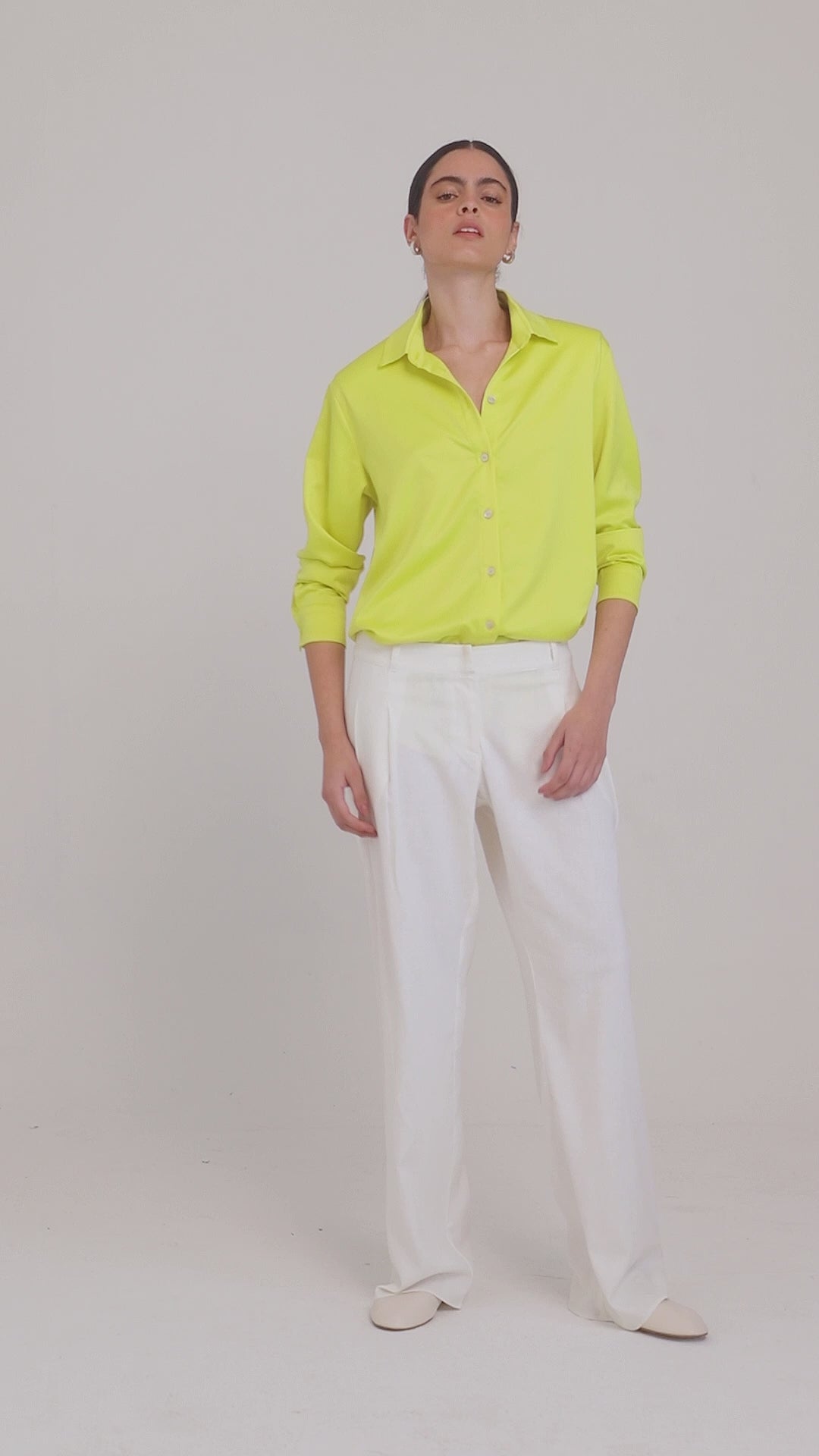 Oversize shirt of fluid and satin fabric. Curved cutting termination and natural pearl butterfly.