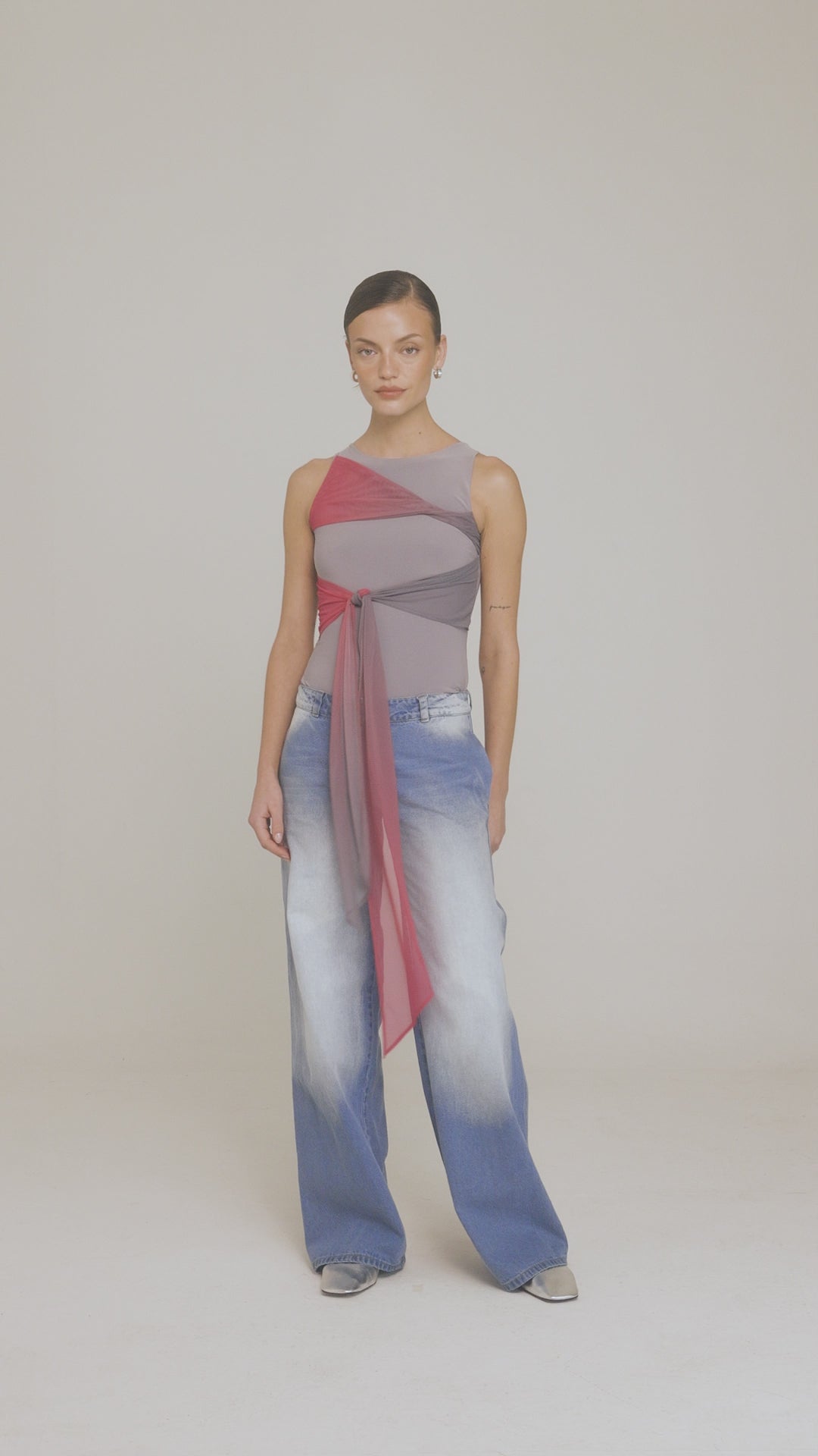 Bodysuit with draping detail in mesh with a gradient print. Crotch closure with snaps