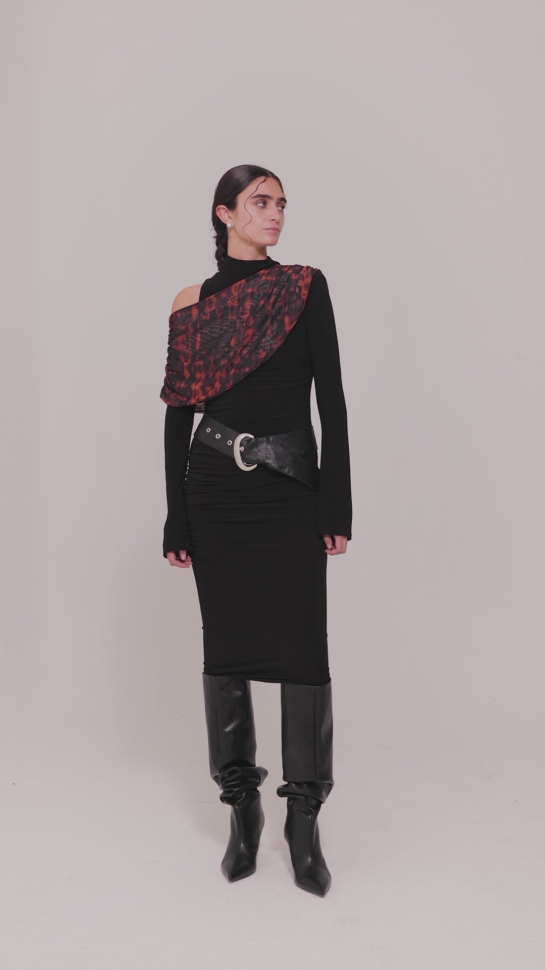 Off-shoulder long dress with sleeves in cool lycra and draped printed mesh. Inner lining and shoulder pad. Belt not included.