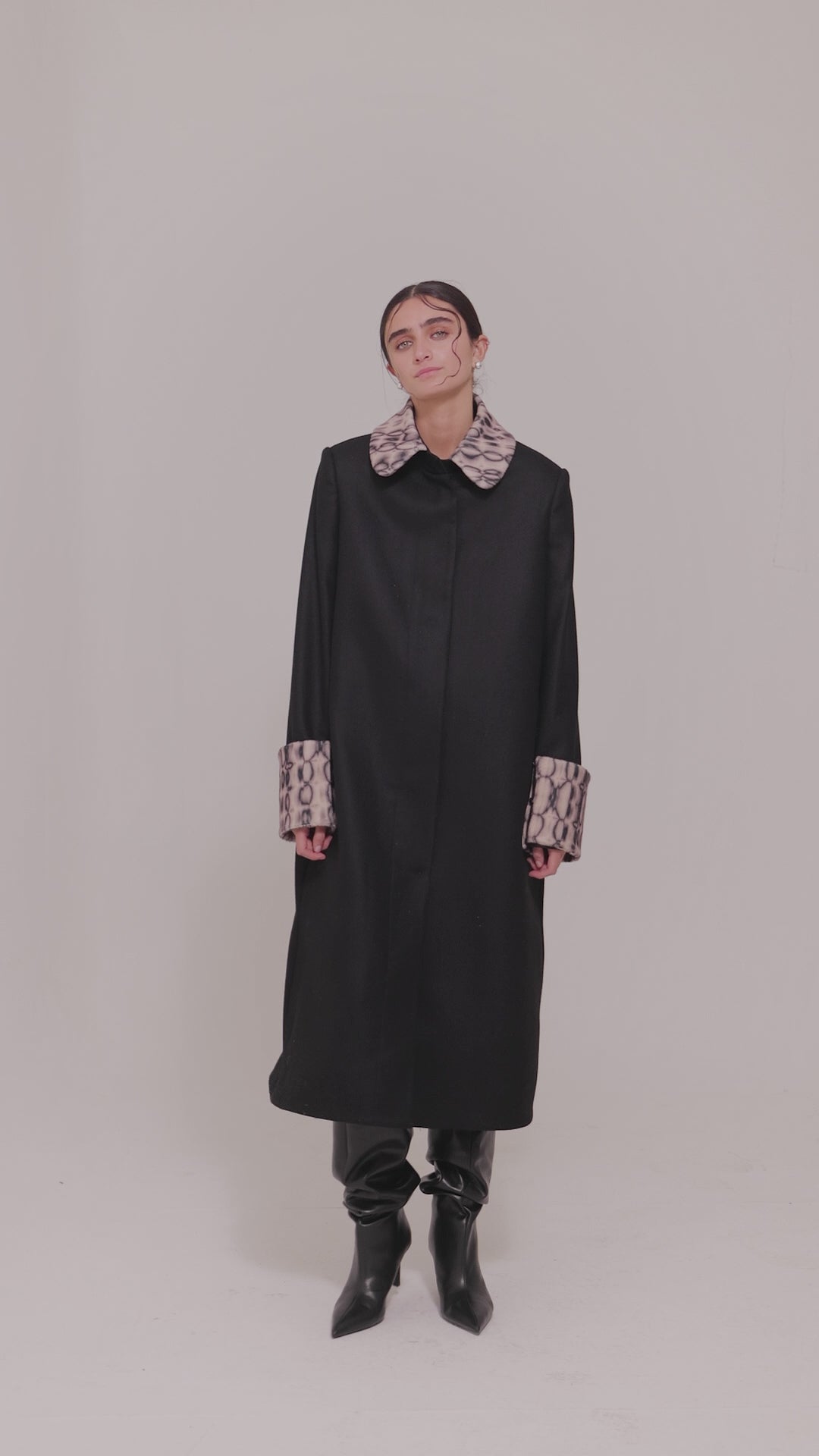 Straight midi coat in 100% cashmere wool. Front crossover with snap buttons. Lined interior. Side pockets. Detachable collar and cuffs.