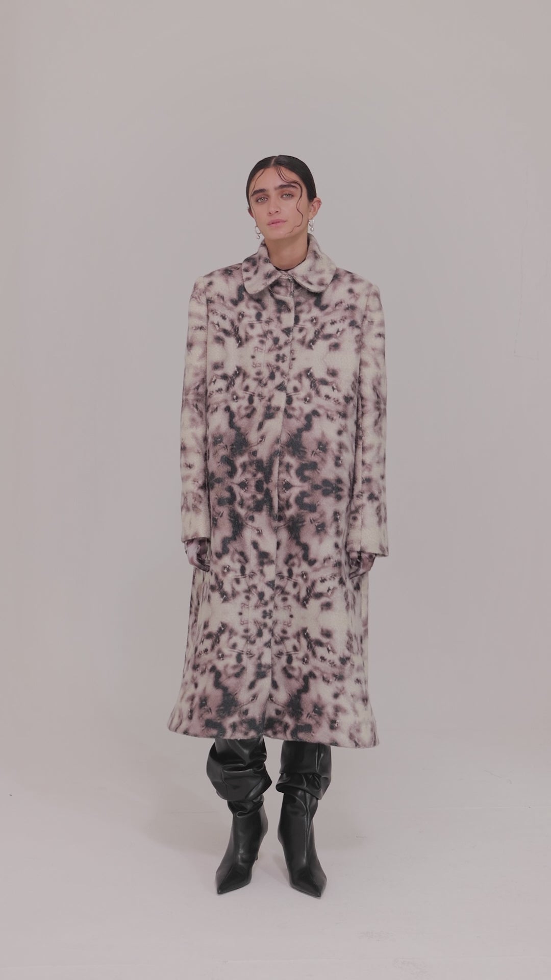 Straight midi coat in printed polyester wool. Front crossover with snap buttons. Lined interior. Side pockets.