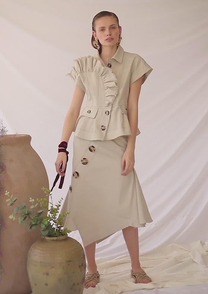 Gabardine, asymmetric midi skirt, with big Carey buttons detail. Contrasted stitches.