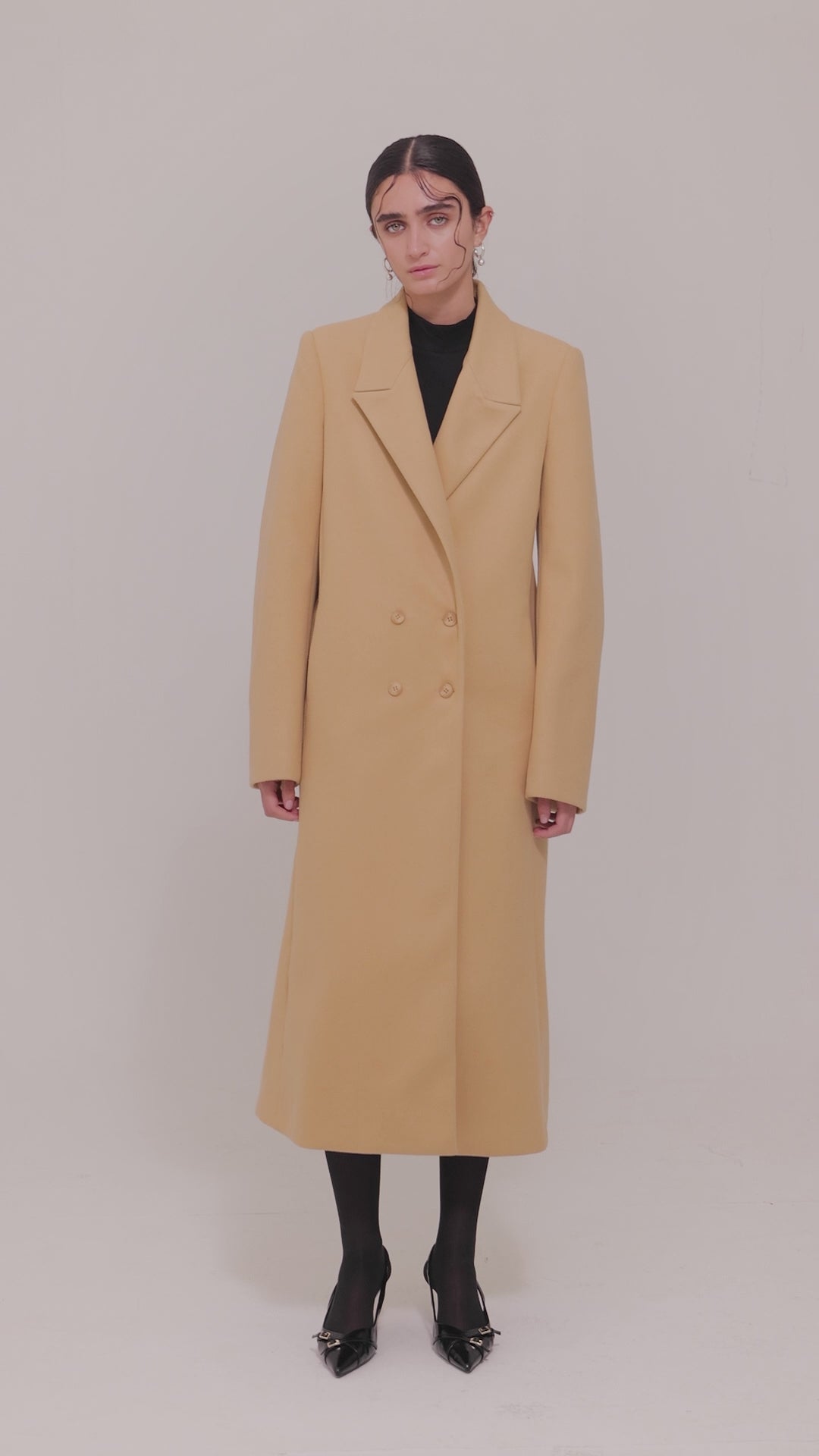Straight midi coat in polyester wool. Front button closure with wide lapel. Lined interior. Side pockets.