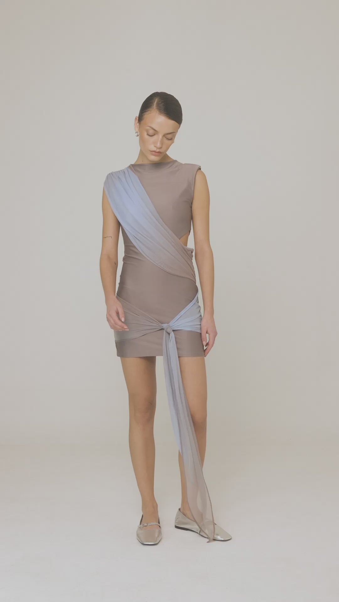 Sleeveless lycra mini dress with shoulder pads. Drapped mesh detail, with gradient print.