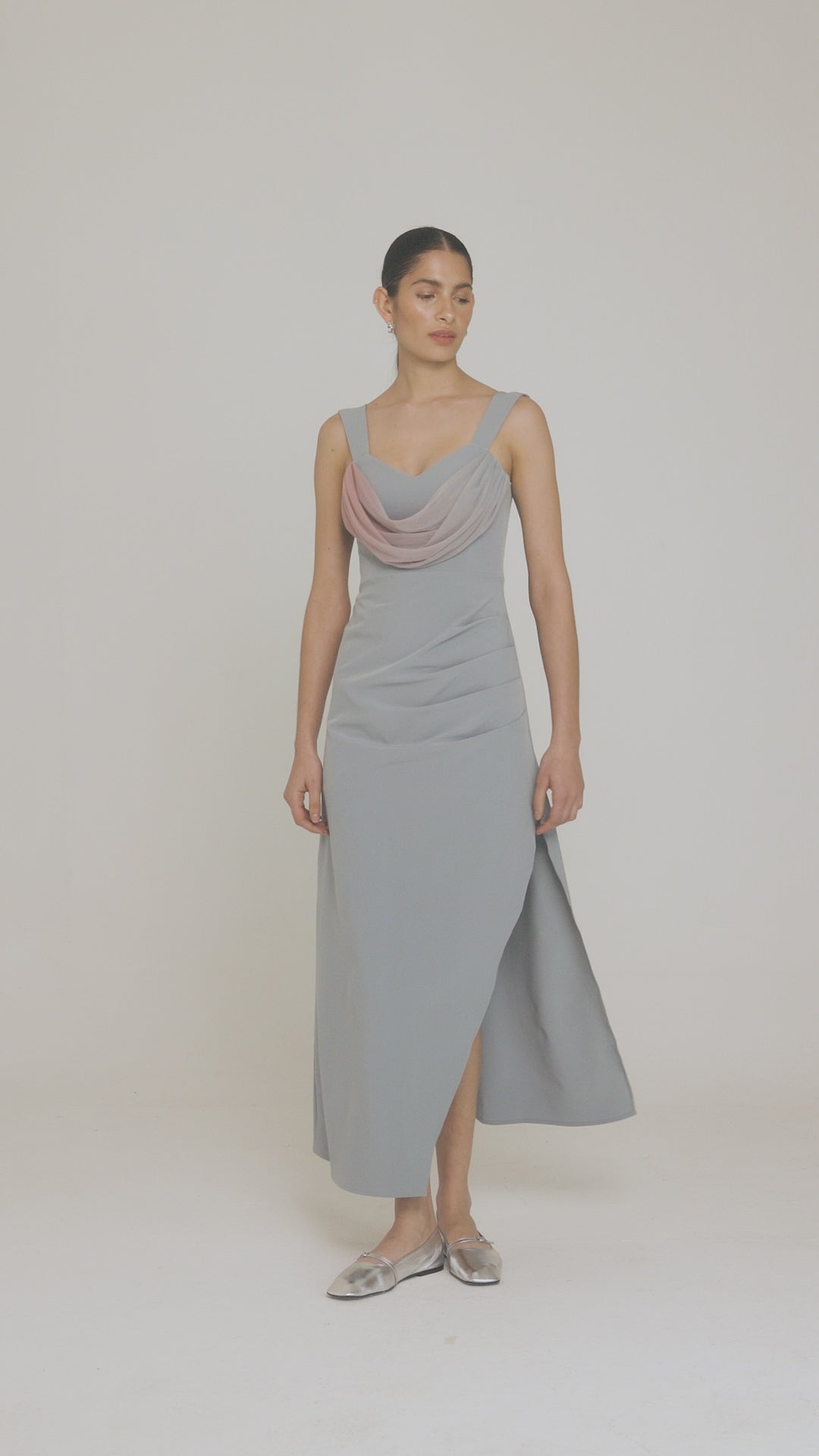 Long dress with gathers on one side, it has mesh drapings with a gradient print at the neckline. Designed with a front slit and side invisible zipper closure.