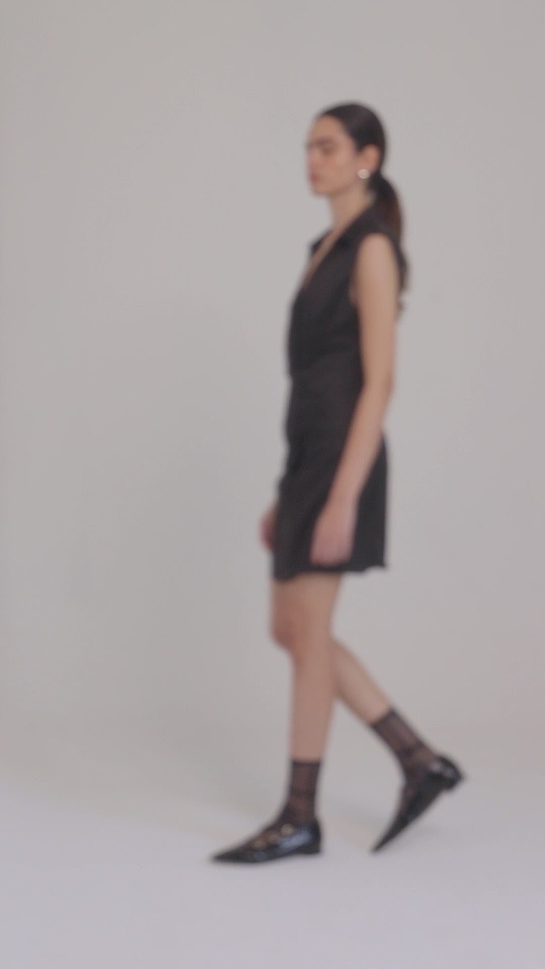 Sleeveless short dress. Constructed in fluid fabric with a V neckline and gathering on the side. Invisible zipper closer on the side.