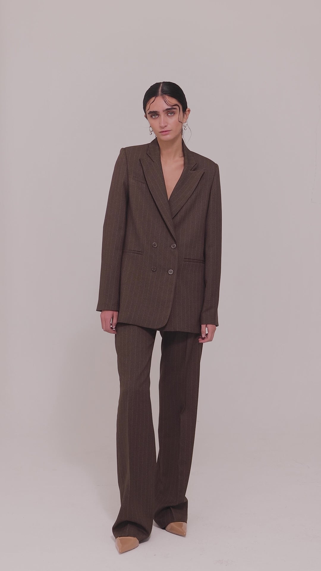 Structured sartorial blazer in blended wool with pinstripe pattern. Double-breasted front closure. Lined interior.