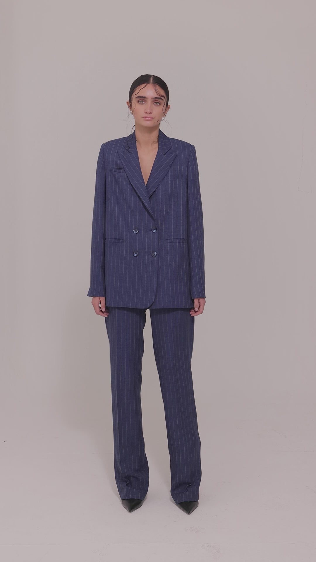 Structured sartorial blazer in blended wool with pinstripe pattern. Double-breasted front closure. Lined interior.