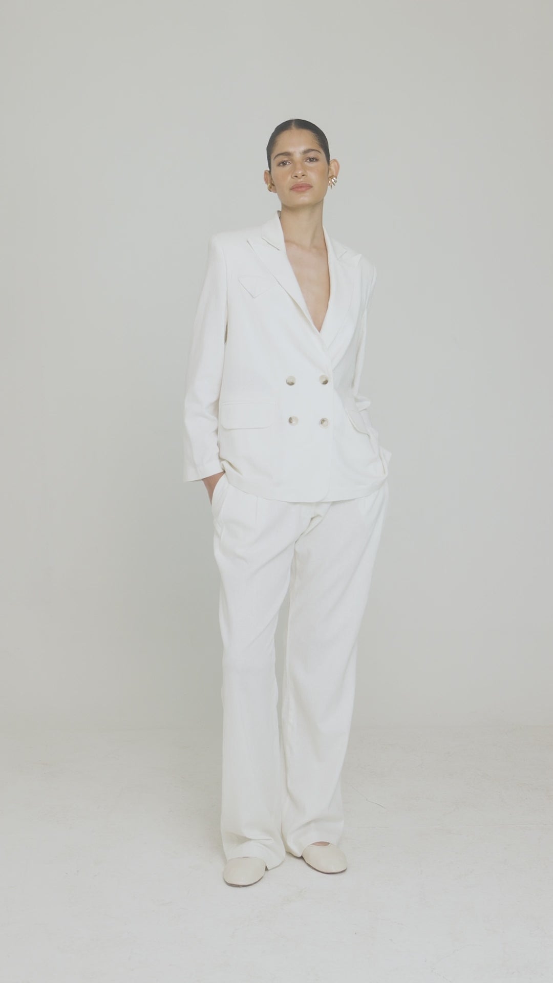Straight jacket in a linen blend with tailored collar, long sleeves and lined shoulder pads. Designed with a double-breasted front closure with tortoise effect buttons and front welt pockets with flap.