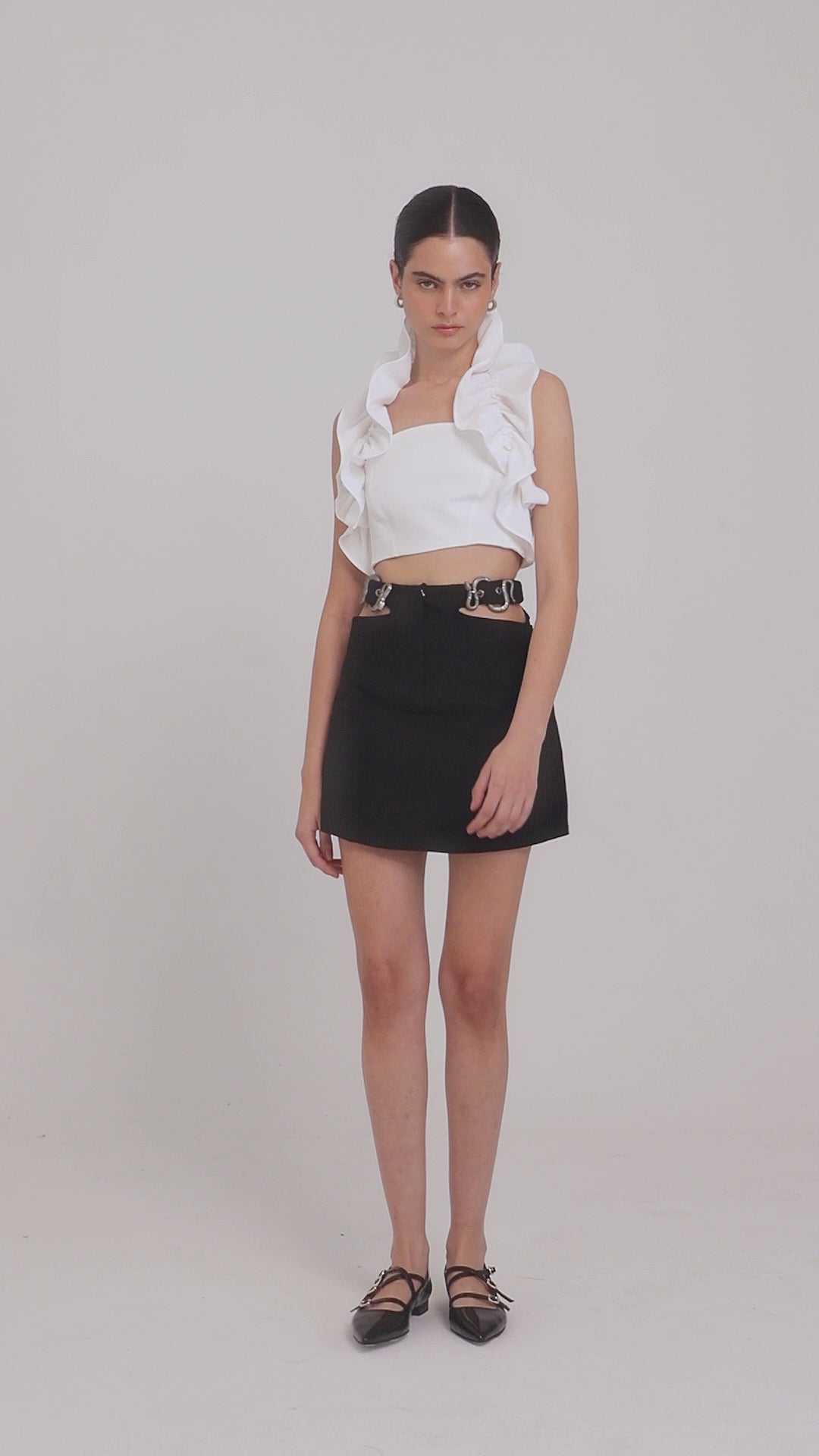 Crop Top in corrugated fabric, with a ruffled neck and metal closure on the back.