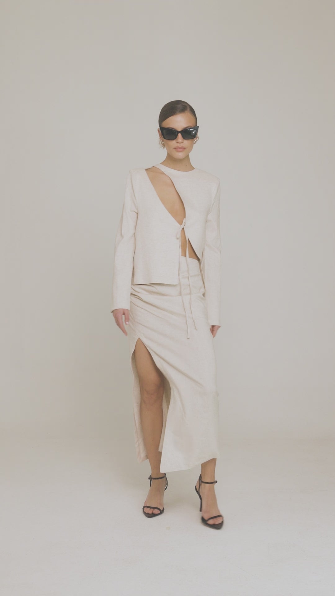 Midi skirt in linen blend, with asymmetric hem and side gathered detail. Side slit and back closure with invisible zipper.