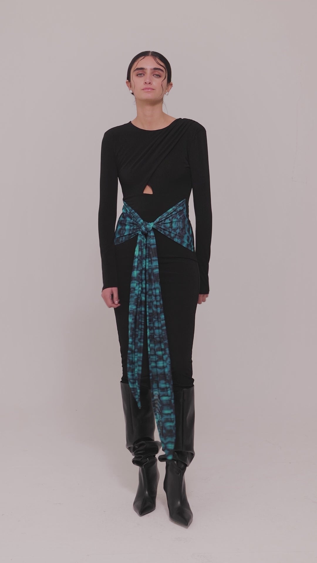 Midi dress with sleeves in cool lycra and draped printed mesh. Triangular cut-out detail on torso. Inner lining and shoulder pads.