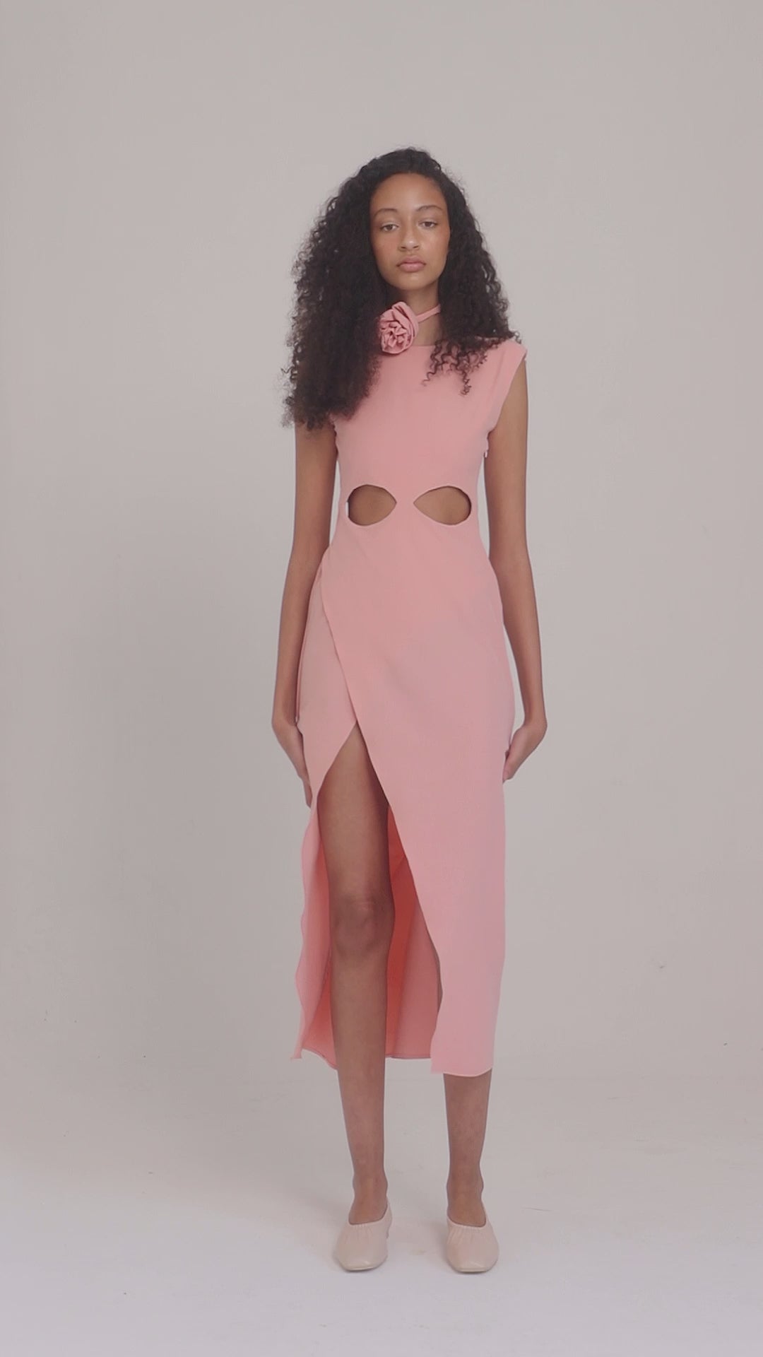 Long sleeveless textured crepe dress with shoulder pads. Detail of openings on the lower bust and leg.
